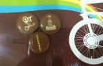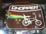 showing my collection of a NOS Raleigh Chopper Retro Sling Bag and 3 Pin Badges and a Key Chain.