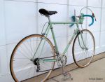 Fully restored lug less frame and unique front stick shift derailleur, it also has a thin sloping fork crown. The frame work shows technology and craftsmanship in great advancement at that time. This bike is extremely light too.